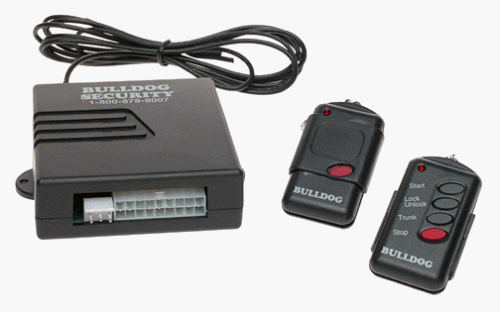 The Bulldog RS202E  Extend Range Car Start with remote control includes heavy-duty external relays,  tach or tachless hookup, and a trunk release feature, plus a four relay pack for  untroubled installation. The Bulldog RS92 Remote Car Starter comes with a  limited lifetime warranty.